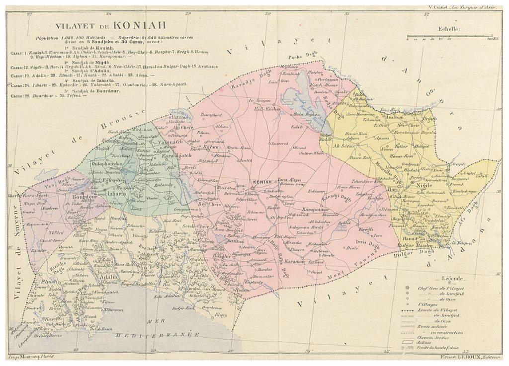 Covering a territory of 91,620 sqkm, the Ottoman Vilayet of Konya comprised the five sancaks Konya, Niğde, Isparta, Burdur, and Adalya (Tekke/Elmalı), subdivided into 30 kazas.